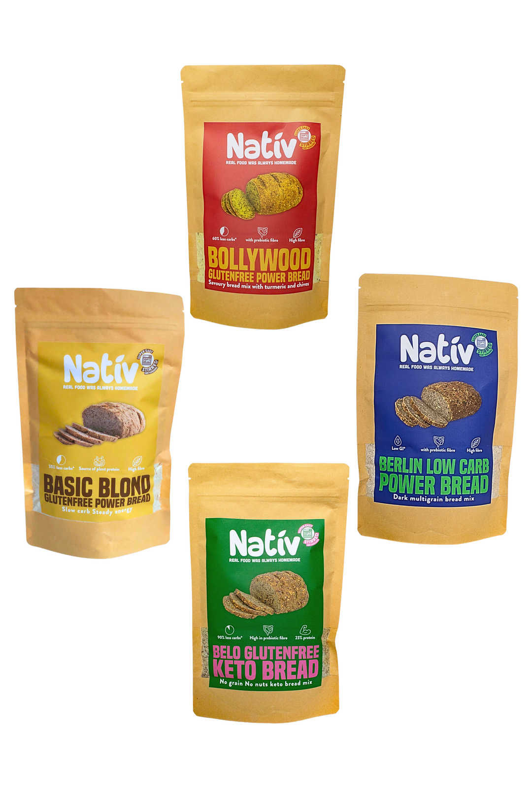 Onze collectie vezelrijke glutenvrije broodmixen , geschikt voor verschillende voedingsvoorkeuren, van (s)low carb tot keto. Allemaal zonder lactose of noten.