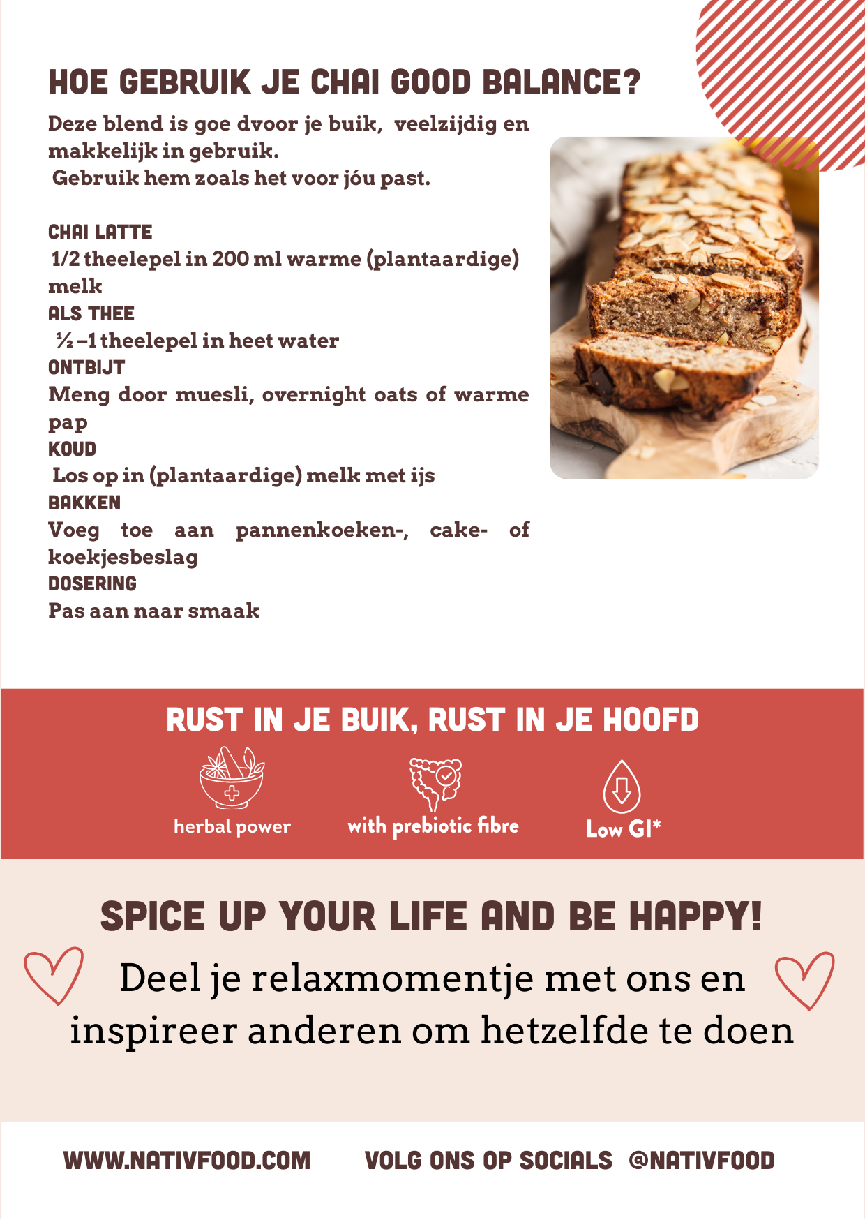 Chai kruidenmix (kaneel, gember, kardemom, nootmuskaat, kruidnagel, piment, citrusschil, zwarte peper), inuline, baobabpoeder, psylliumvezelpoeder