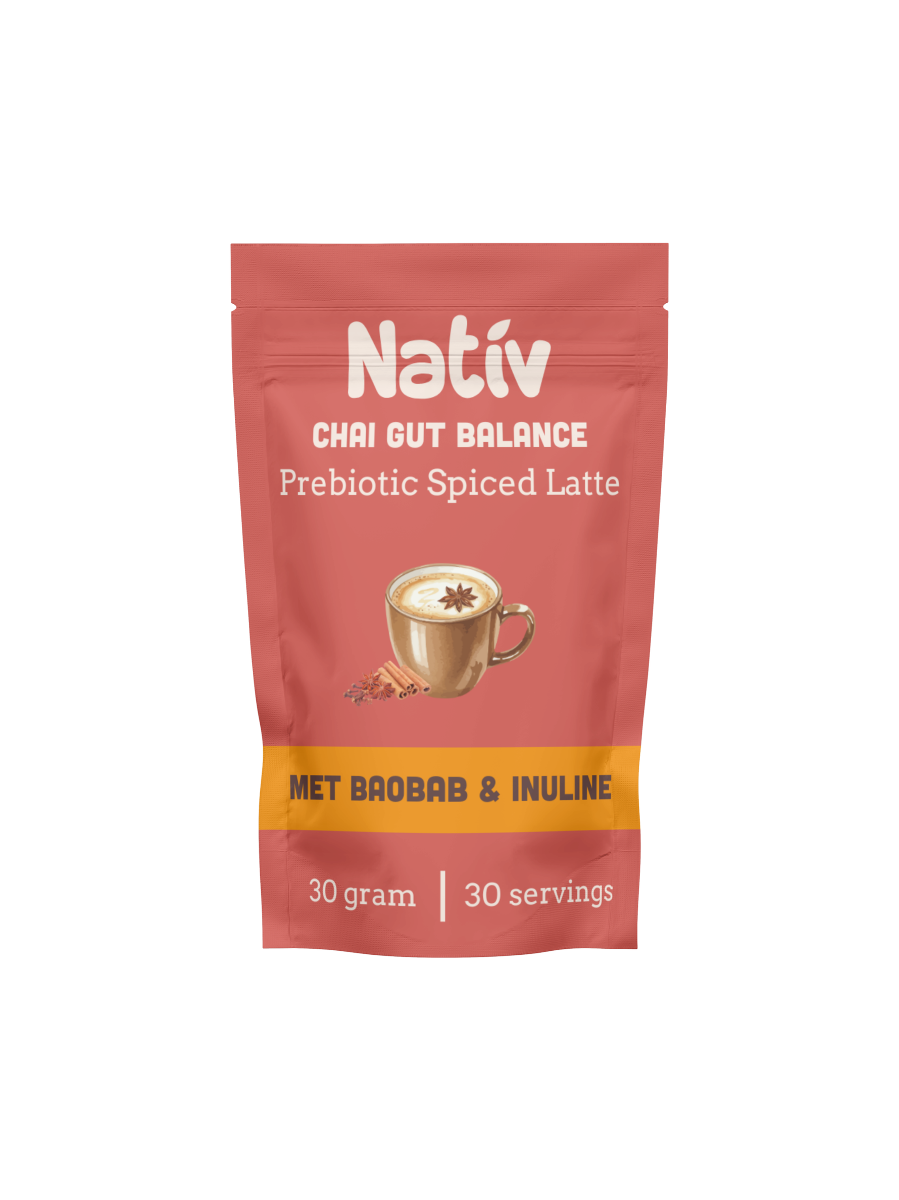 chai kruidenmix (kaneel, gember, kardemom, nootmuskaat, kruidnagel, piment, citrusschil, zwarte peper), inuline, baobabpoeder, psyllium husk poeder