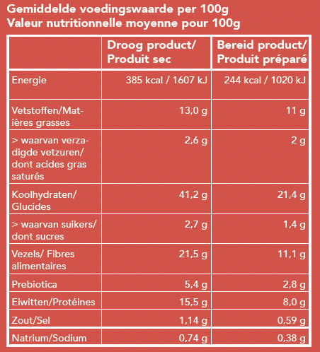 glutenvrije haver, boekweit, lijnzaad, kokosmeel, gedeeltelijk ontvet zonnebloempitmeel, psylliumvezel, wijnsteenbakpoeder, zout.
